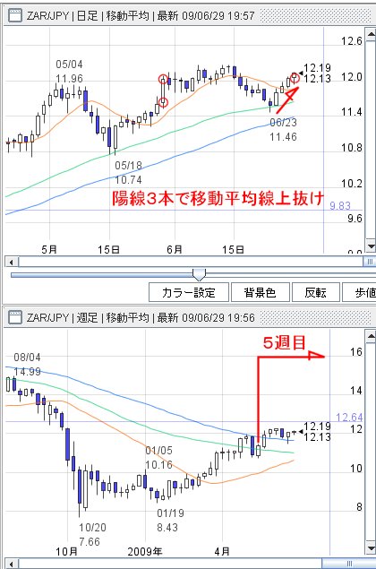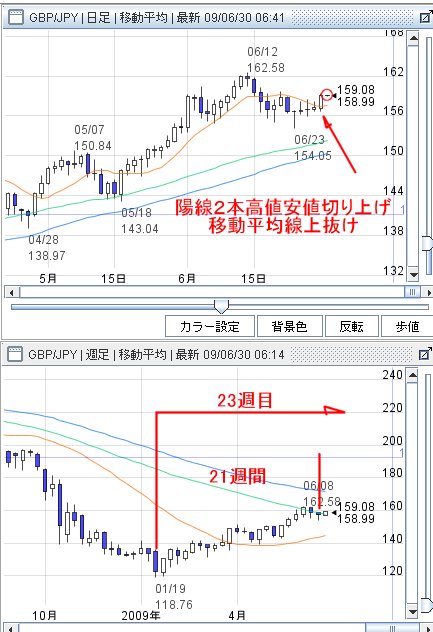 陽線2本と移動平均線上抜けをサインとして