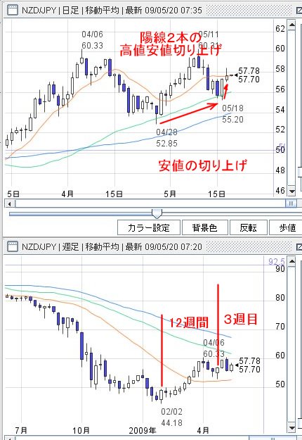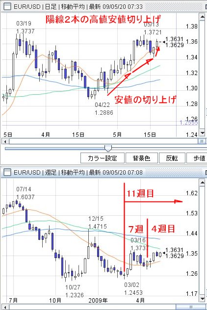 日足での陽線2本の高値安値切り上げを見て