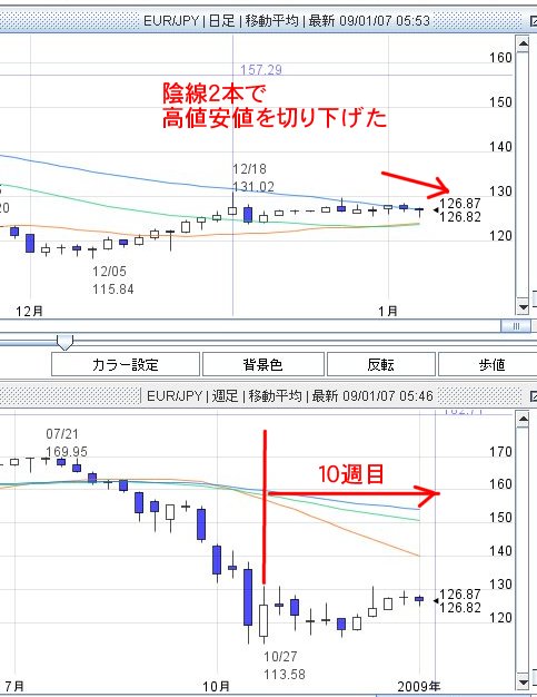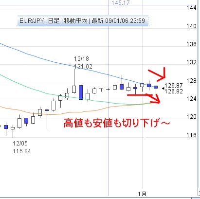 ユーロ円が陰線2本で高値安値を切り下げました。