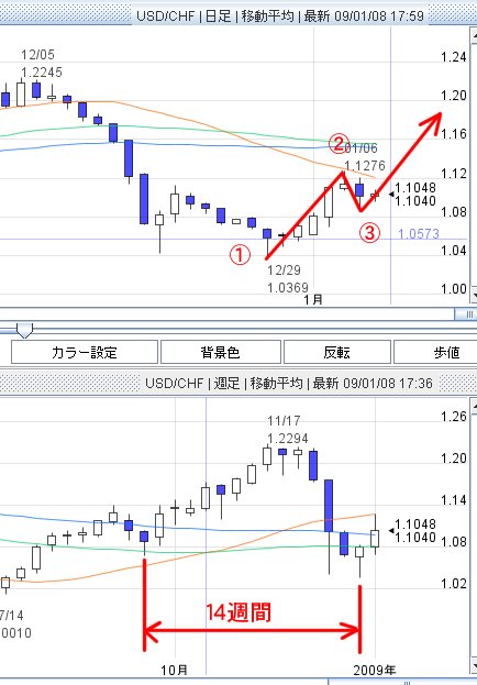 ドル・スイスフランでダウ理論の1~3を見つけた。